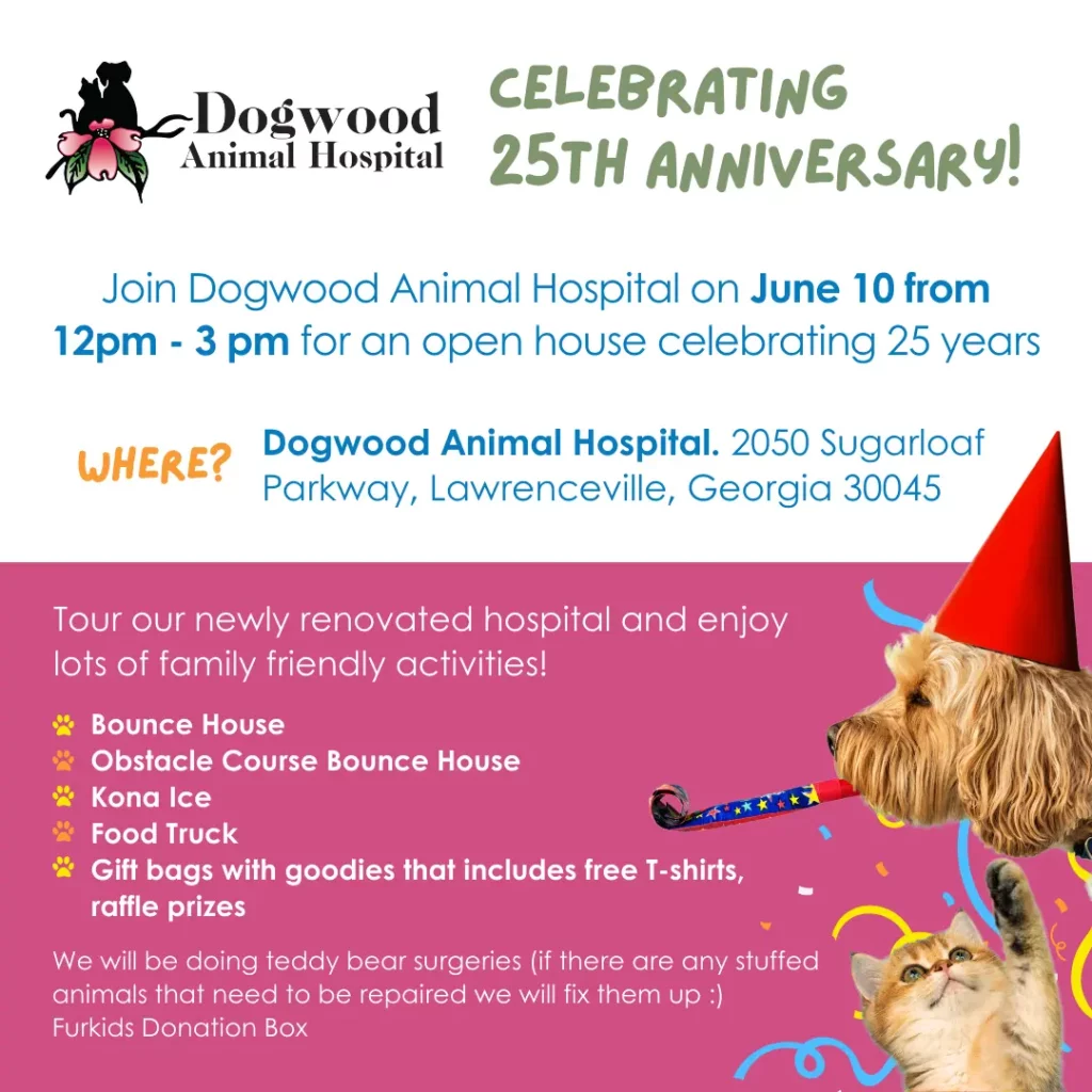 Join Dogwood Animal Hospital on June 10 from 12:00pm – 3:00pm for an open house celebrating our 25th anniversary!